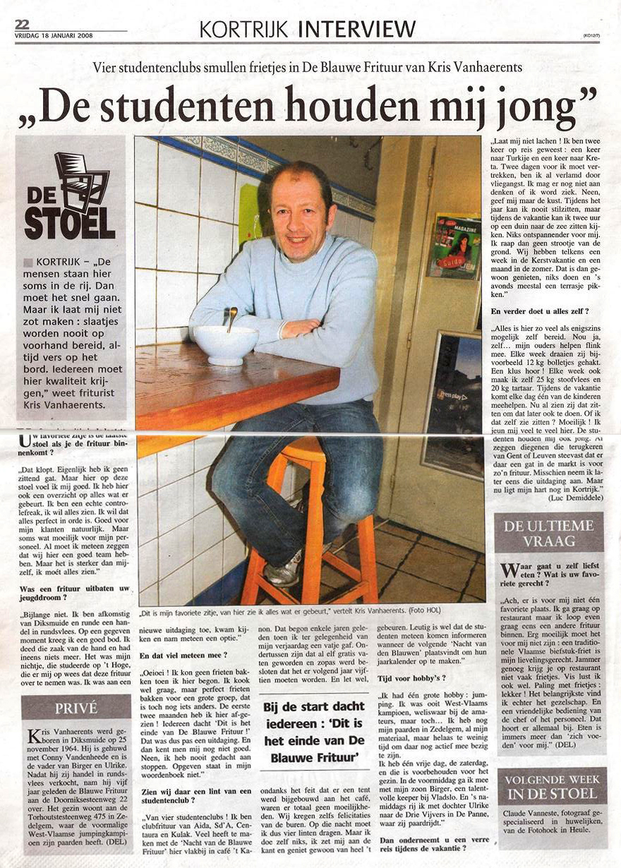 "Voor de perfecte fond voor het stappen gaan moet je naar De Blauwe Frituur in Kortrijk, het beste frietkot dat er is. Heel veel studenten en studentenclubs gaan daar naartoe.